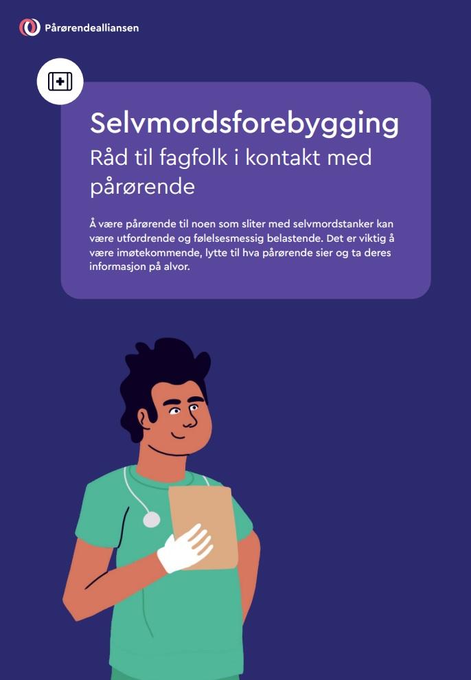 Pårørendealliansen har i samarbeid med Nasjonalt senter for selvmordsforskning og -forebygging (NSSF) utarbeidet informasjon og materiell som kan hjelpe pårørende i en krevende situasjon. I dette arbeidet har vi også utarbeidet informasjon og råd til helsepersonell og andre fagfolk som møter pårørende som er bekymret for selvmordstanker i nære relasjoner.